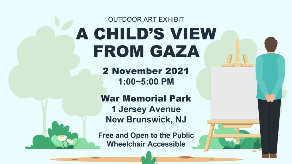 A CHILD’S VIEW FROM GAZA, an exhibit of Palestinian children’s art, will be on view on Tuesday, November 2, from 1:00 PM to 5:00 PM at the War Memorial Park, 1 Jersey Avenue, at the intersection of Handy Street in New Brunswick, New Jersey.