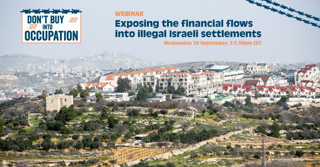On behalf of the Don’t Buy into Occupation Coalition (DBIO), we invite you to a virtual event to launch of the first DBIO report “Exposing the financial flows into illegal Israeli settlements”. The DBIO coalition is a joint initiative between 25 Palestinian, regional and European organisations based in Belgium, France, Ireland, the Netherlands, Norway, Spain and the United Kingdom. The coalition aims to investigate and expose the financial relationships between business enterprises involved in the illegal Israeli settlement enterprise in the Occupied Palestinian Territory and European Financial Institutions.The webinar will be a panel discussion, followed by Q&A.
